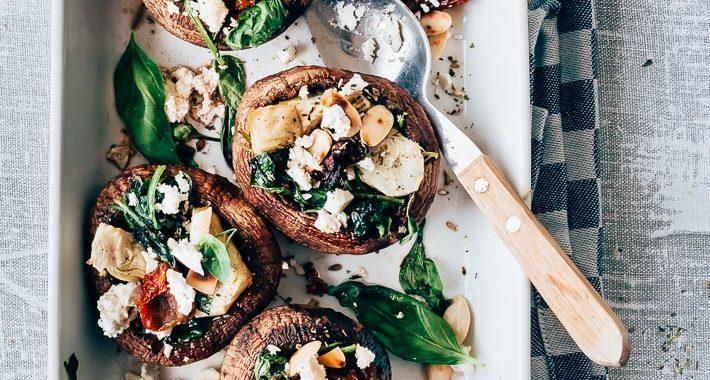 Dat is altijd een extra uitdaging voor mij. Ik ben gek op nog wat extra ingrediƫnten in de pan bakken zodat het nog lekkerder wordt en dan overheen strooien. Maar in dit geval moet alles goed kunnen garen in de oven. Uiteindelijk bedacht ik deze combinatie: portobello met spinazie, artisjokken en zongedroogde tomaat! Dat kan natuurlijk niet verkeerd! Lekker met een topping van vers verkruimelde feta, amandelen en verse basilicum blaadjes! En een drizzle lekkere olijfolie! Combineer deze gevulde portobello met een snelle couscous (bijvoorbeeld met verse kruiden: munt, koriander en peterselie en gebakken fijngehakte ui en knoflook).