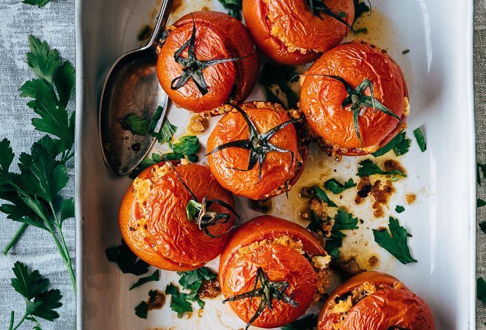 Quinoa is quinoa. Het is geen lekkere zachte pasta. Het heeft een bite en er zit smaak aan. Een nootachtige smaak die niet iedereen even lekker vindt. Wanneer je echt geen fan bent van quinoa dan kun je dit recept ook maken met bruine rijst (te koop bij biowinkel) of met volkoren couscous. Voor de rest van de vulling maak je een dikke tomatensaus met stukjes courgette en feta. Wanneer je wilt dat de tomaten netjes rechtop in de ovenschaal blijven staan snijd dan aan de onderkant van de tomaat een heel dun plakje, zodat ze netjes blijven staan tijdens het vullen en bakken.