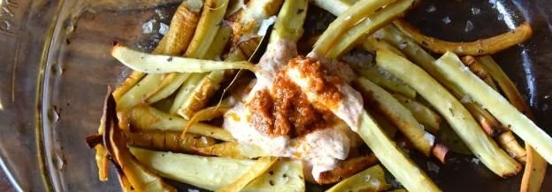 Liever maak ik dus mijn eigen friet. In de oven. Van pastinaak, bijvoorbeeld. Met dit recept maak je frietjes voor twee personen; genoeg als bijgerecht in combinatie met een stukje gegrilde zalm, bijvoorbeeld. Tip: serveer met mayonaise waar je een beetje sambal doorheen roert, voor een pittige twist!