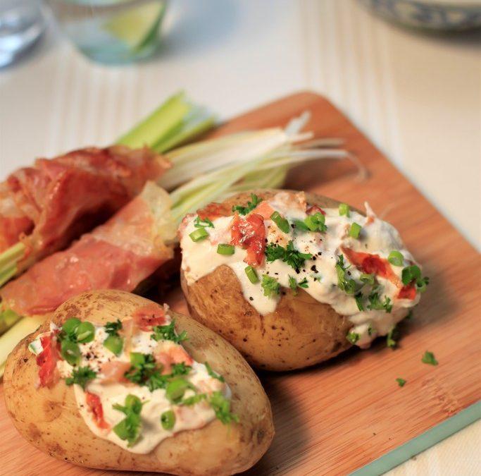 Schep een deel uit de aardappels en strooi er wat peper en zout op. Doe dit met de bosui, de stukjes ham en Griekse yoghurt in een schaal en roer het geheel goed door elkaar.