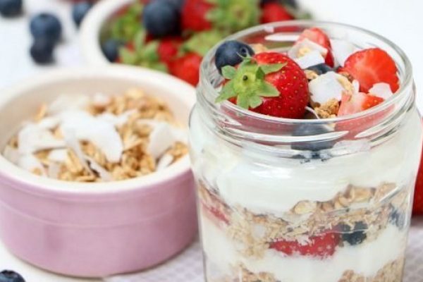 Ontbijt trifle met kokos granola en aardbeien 06 juni 2018