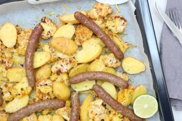 Traybake met geroosterde bloemkool, krieltjes en worst 14 juni 2018