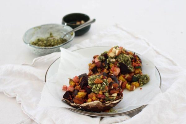 Gevulde portobello met bulgur, biet, groene pesto en amandelen 21 maart 2018