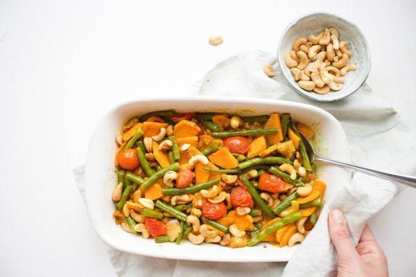 Zoete aardappel ovenschotel met sperziebonen en cashewnoten 23 juli 2017