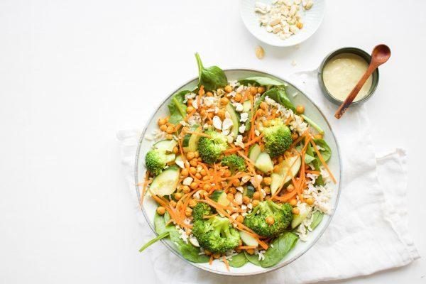 Thaise currysalade met rijst, geroosterde kikkererwten en currydressing 28 april 2017