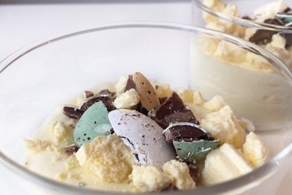 Paasmenu: witte chocolade mousse met topping van paaseitjes 13 april 2017