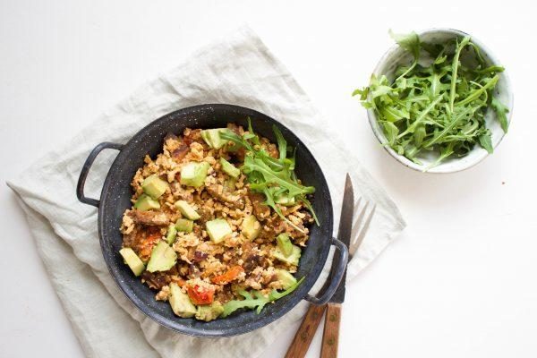Scrambled egg met tempeh, avocado en rucola 06 april 2017