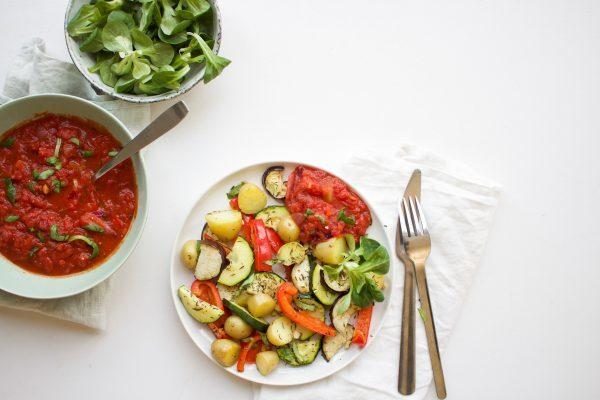 Geroosterde groenten en aardappel uit de oven met pittige tomatensaus 14 maart 2017