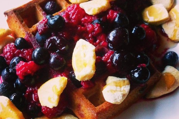 Plantaardige wafels met warme bosvruchten en knapperige perzikstukjes van NADA 18 januari 2017