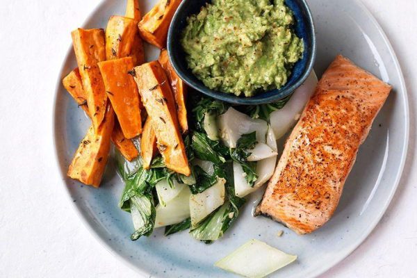 Gegrilde zalm met avocadodip, paksoi en zoete aardappel 17 januari 2017