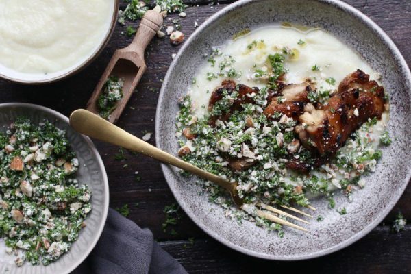 Bloemkoolpuree met kippendij en feta crumble 17 november 2019