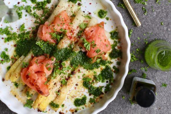 Gegratineerde asperges met parmezaanse kaas en peterselie olie 16 april 2019