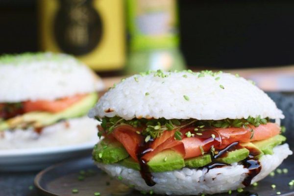 Sushi burger met gerookte zalm en unagi saus 03 april 2019