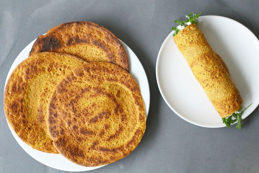 Afgelopen week was ik aan het werk op een beurs in Essen en iedereen die wel eens op beurzen werkt weet dat de lunches daar vaak niet heeeel gezond zijn. Zacht uitgedrukt. In Duitsland staat er voornamelijk schnitzel, patat en worst op het menu. Omdat ik op zo’n lange dag echt een gezonde bodem nodig heb bakte ik op de dag voordat ik wegging een aantal van deze glutenvrije wortelwraps, bewaarde ze in het koelkastje op mijn hotelkamer en nam ze de volgende mee naar de beurs. Bij het ontbijt nam ik wat geitenkaas, komkommer en kipfilet mee en met de lunch was het enkel nog een kwestie van vullen en oprollen. Heeel lekker en duizend keer gezonder dan dat kant en klare kantinevoer.