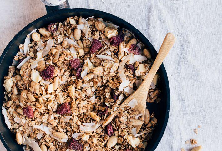 Ik kom er niet altijd aan toe, maar zelf granola maken is toch echt het allerlekkerst. Je kunt hem precies zo maken zoals jij wilt, met je favoriete ingrediƫnten. Deze granola met gedroogde frambozen en witte chocola is mijn nieuwe favoriet. Ik voeg er ook nog wat kokos, amandelen, honing en kaneel aan toe. Voor de basis gebruik ik havermout. Maar je kunt allerlei smaakmakers gebruiken natuurlijk. Denk aan hazelnoten, pecannoten, pure chocola, rozijnen of gepofte boekweit.