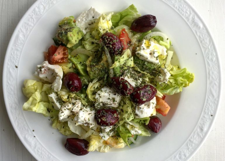 Snijd de komkommer, avocado en tomaten in robuuste blokjes. Lek de feta uit en brokkel deze in stukken. De ui snijd je door de helft en vervolgens in flinterdunne plakjes. Leg de botersla op je bord, voeg vervolgens de ui, tomaten, komkommer, feta, avocado en olijven toe. Besprenkel naar eigen smaak je salade met de rode wijnazijn en olijfolie. Nu nog flink wat gedroogde oregano er overheen, en de gedachten aan je vorige zomervakantie kunnen beginnen!