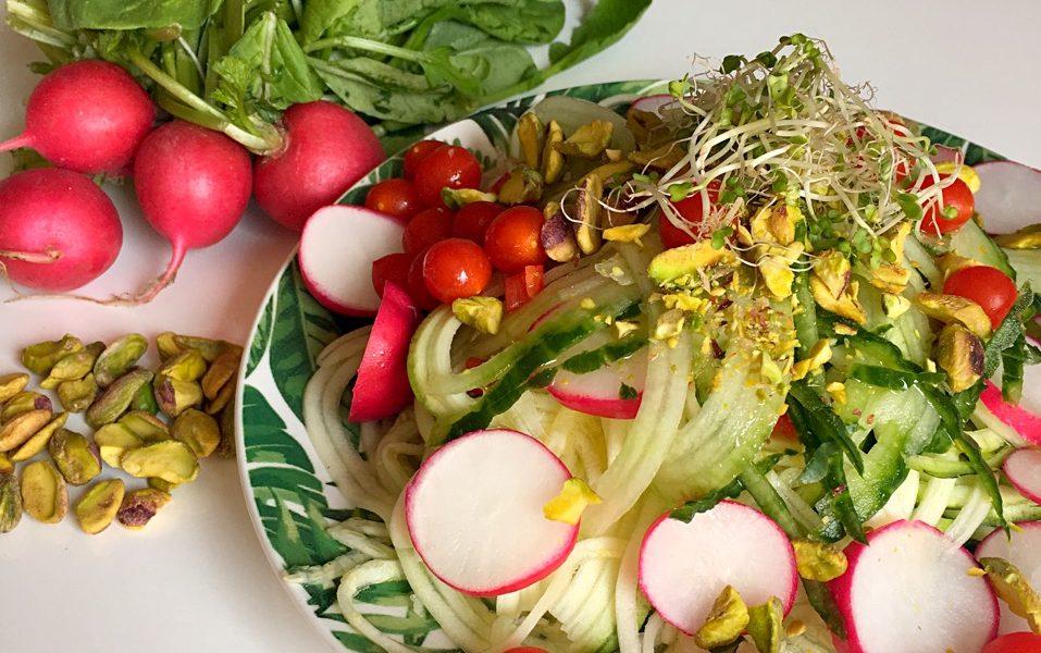 Een blik op de fruitschaal leerde me dat we nog een courgette hadden, een halve komkommer en een bos radijs. Uit de koelkast toverde ik nog een en ander, en na wat draai- en husselwerk toverde ik een bijzonder lekkere salade op tafel. Omdat ik alleen maar groene en rode producten had gebruikt, doopte ik dit tot "groen rode salade met een bite". De bite zit hem niet alleen in de knapperigheid, maar ook in de spicyness van dit gerecht, waar zowel de radijs als het mini stukje rode peper voor zorgen. Als je wel een planner bent, maak deze salade dan vooral de avond van tevoren. Kan je hem lekker meenemen naar werk.