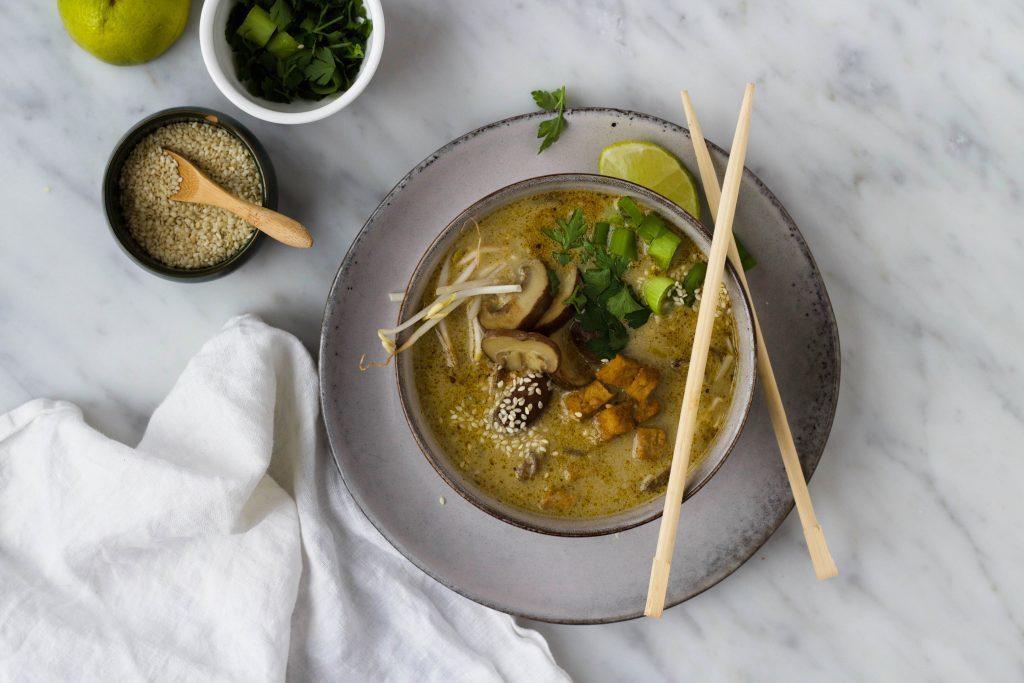 Een verwarmende en kruidige soep gemaakt van curry, bouillon en kokosmelk. Met een vulling van noedels, tofu (voor de eiwitjes), paddenstoelen en verschillende toppings. Heerlijk!