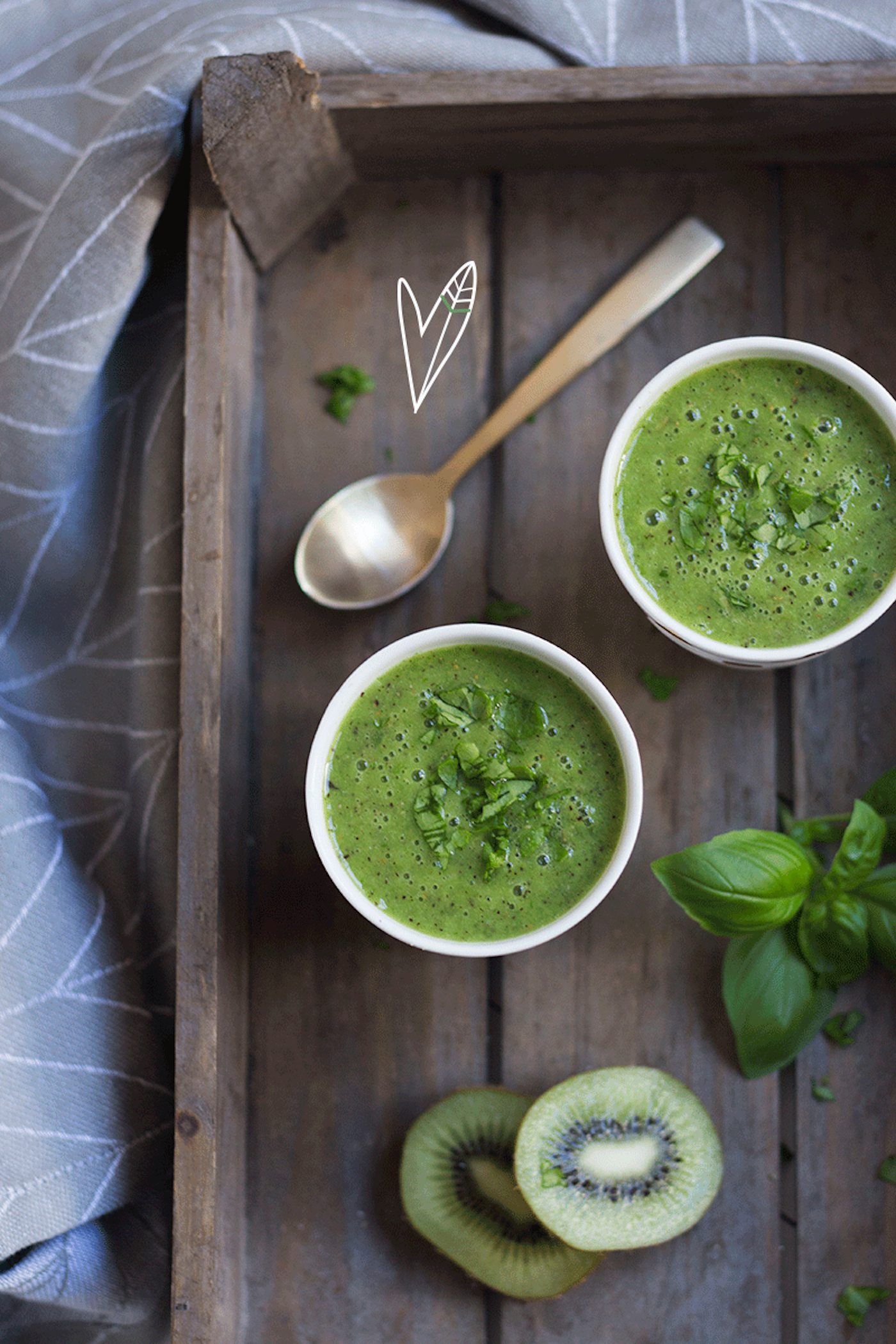 - 4 bevroren kiwi’s (zonder schil)- 1 hand spinazie- 1 glas amandelmelk- takje verse basilicum