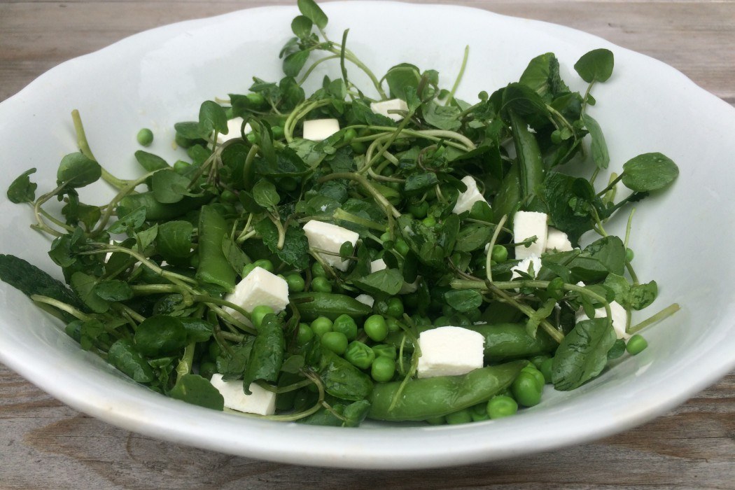 Kook de erwten in 5-6 minuten beetgaar en blancheer de sugar snaps 2-3 minuten. Laat afkoelen en maak ondertussen de dressing. Meng het citroensap met de honing en voeg al roerend de olijfolie toe. Breng op smaak met een snuf peper en zout. Hak een handvol muntblaadjes fijn en meng met de waterkers, sugar snaps en erwten in een grote schaal. Verdeel de dressing over de salade en maak af met de feta. Op naar buiten!