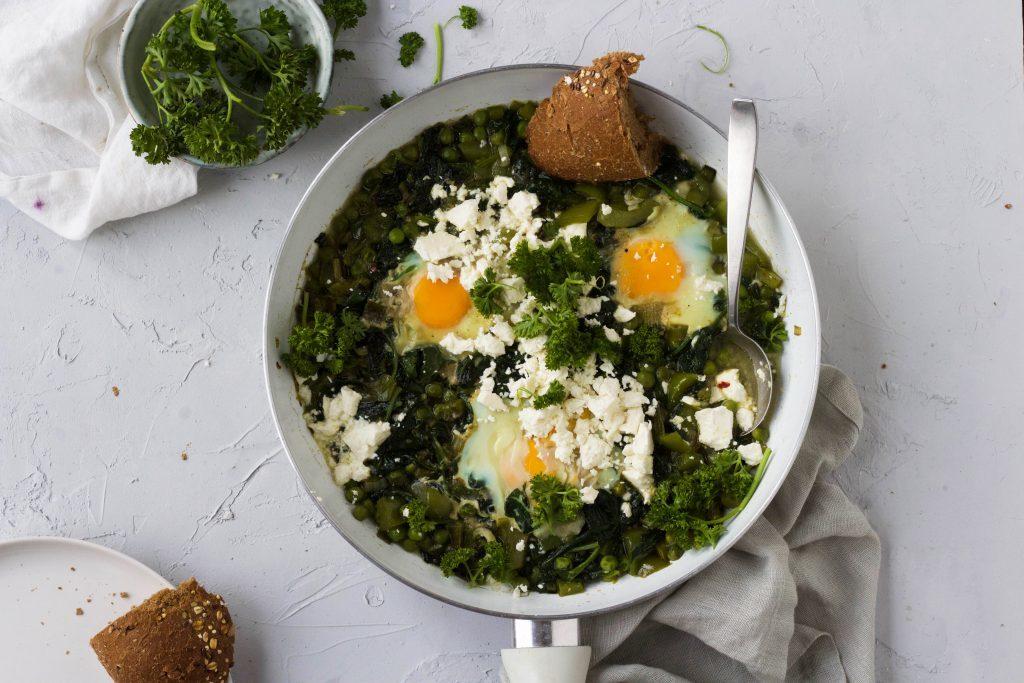 Groene shakshuka, ook wel ‘green shakshuka’ genoemd, maak je met… groene ingrediënten. Eigenlijk zijn er geen vaste ingrediënten waar dit gerecht aan hoeft te voldoen. De basis bestaat vaak wel uit spinazie of boerenkool en natuurlijk ei.