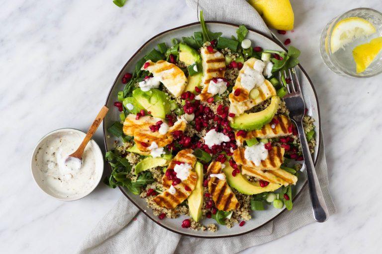 Deze salade is zo lekker! Vooral op warme, zonnige dagen zoals afgelopen week, omdat de halloumi een beetje zoutig smaakt. De halloumi combineert heel goed met de frisse smaken van de avocado en granaatappelpitjes. De yoghurt dressing maakt de salade lekker fris.