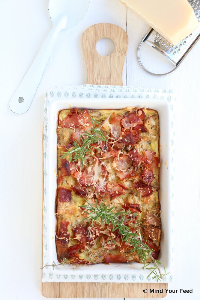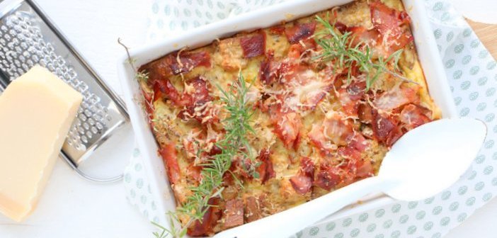 Wie zegt dat een broodpudding alleen zoet kan zijn? Ik na vandaag zeker niet meer! Er staan al een aantal recepten op de blog voor zoete recepten waar ik heel graag mijn dag goed mee start. Maar voor de verandering zou je prima een hartige broodpudding op tafel kunnen zetten. Bijvoorbeeld deze glutenvrije variant met bacon en pittige Parmezaan. Het is bijna een hartig taartje, een feestje op tafel dus!