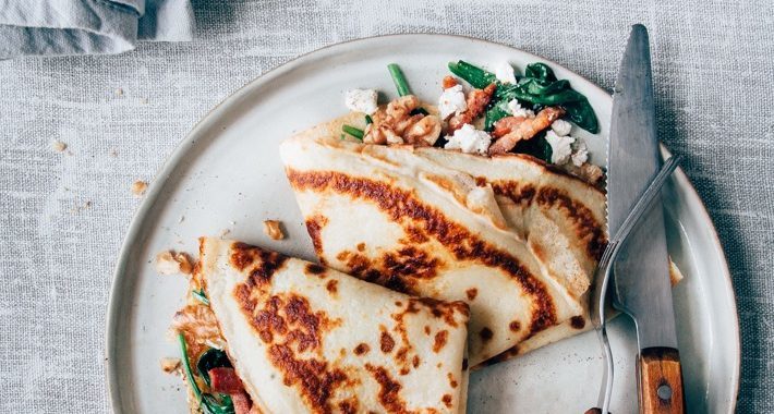 De truc, een kwastje met boter. Inderdaad zo simpel is het. De pan goed heet, met een kwastje de bodem van de pan invetten met boter. Beslag er in, wanneer er belletjes in het beslag ontstaan keer je de hartige pannenkoek om. Even checken of hij mooi goudbruin is aan de onderkant en dan flip de lucht in! Dat laatste doe ik dan niet, ik keer de pannenkoek met beleid om. Gebruik overigens een silliconen kwastje bij het invetten van de bodem van de hete pan! Van mijn houten kwastje met paardenhaar bleef niet veel over. Dan weet je dat!