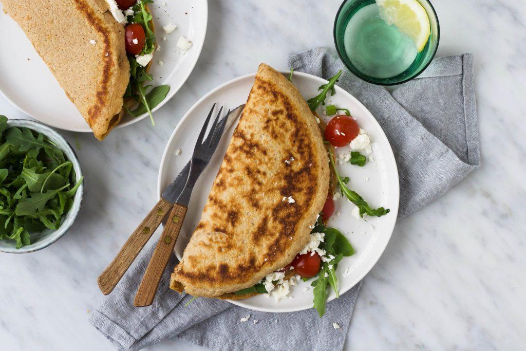 Pannenkoeken van volkoren speltmeel passen perfect bij een hartige variant. Je kunt de pannenkoek natuurlijk vullen met wat je lekker vindt, maar voor deze eerste keer hield ik het vrij eenvoudig met feta, rucola en tomaatjes. Een combinatie die eigenlijk altijd lekker is.