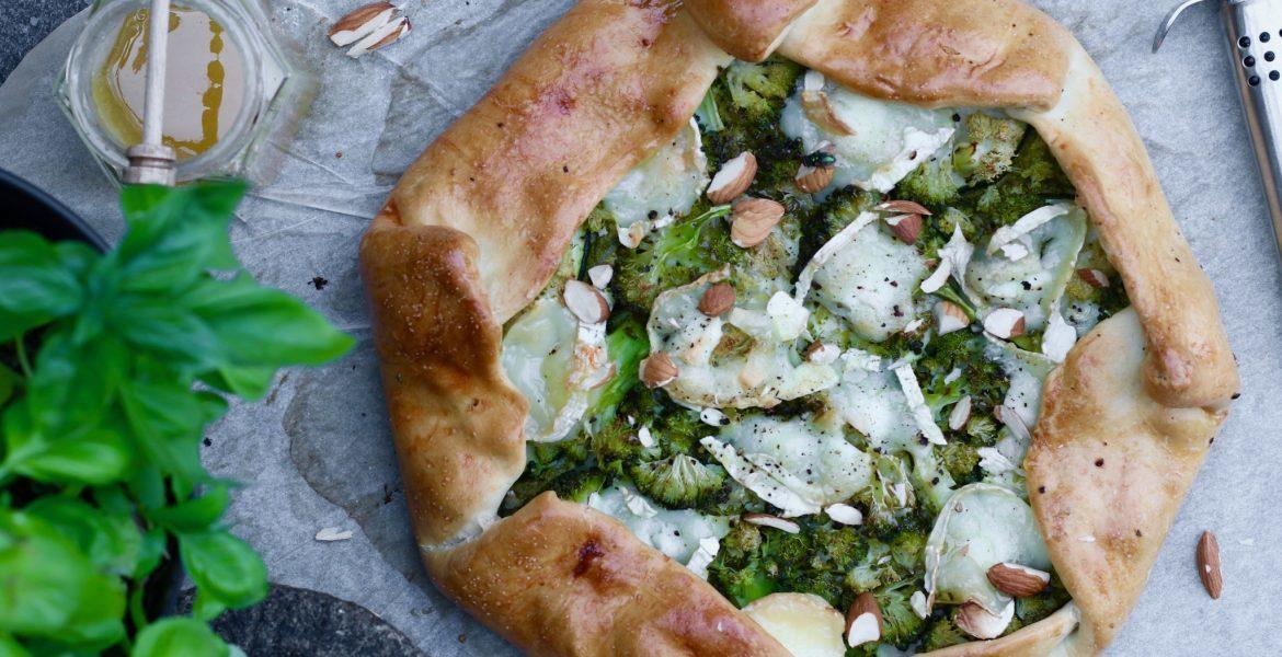 Nu ben ik niet zo’n ster in het zelf maken van deeg en stiekem heb ik daar ook nooit zo’n zin in. Wat doe je dan? Nou, je pakt acht plakjes hartig bladerdeeg, kneed ze door elkaar tot een bal en die rol je vervolgens uit tot een rondje vorm. Klaar is kees! Beleg het deeg vervolgens met zelfgemaakte groene pesto (eerlijk, dat is toch altijd het lekkerst), broccoli roosjes en geitenkaas. Drizzle er ook vooral wat honing over voordat je hem serveert. Ik at deze hartige taart als lunch, maar je kunt hem ook prima maken als avondeten met daarbij bijvoorbeeld een lekkere salade