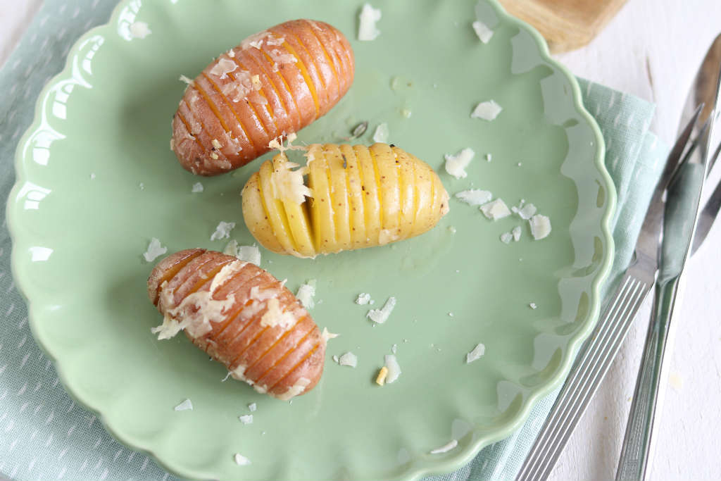 Na het hapjesbuffet van de afgelopen dagen, ga ik direct door met een aantal fijne bijgerechten. Met de Hasselback potatoes begeef ik mij op glad ijs. Mijn hele kerstmenu is Italiaans georiƫnteerd en deze aardappeltjes zijn officieel Zweeds. Door de Parmezaanse kaas vind ik ze eigenlijk wel perfect bij mijn kerstrecepten passen.