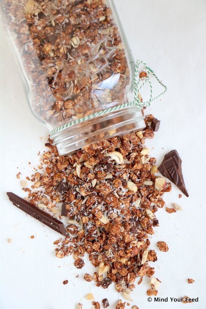 Het is gewoon echt zo. Goede voorbereiding is het halve werk. Ik greep de afgelopen week een paar keer mis. En ik kon daar zó niet tegen dat ik alles opzij heb geschoven en aan de slag ben gegaan. Het kost namelijk maar een paar minuten om deze havermout granola met chocola en kokos klaar te maken. Niks lastigs aan. Maar je moet het wel even doen…. En dus dook ik mijn keuken in. Want als ik iets niet uit kan staan, is als ik wil ontbijten en de pot met granola is leeg….