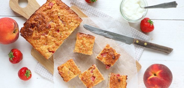 Als ik het zomerfruit zo in de winkels zie liggen, maakt mijn hart altijd een klein sprongetje... Die heerlijke perziken, nectarines, aardbeien, frambozen en verschillende bessen, ik ben er dol op! Zo heerlijk zoet, en alleen de geur is al zó lekker. Toen ik vanochtend door de woonkamer liep, róók ik de perziken op de fruitschaal liggen. Vroeger was ik echt verslaafd aan de geur van perzik, ik kan me zelfs nog herinneren dat ik een keer zo lang aan een perzik heb gesnoven dat ik gewoon een beetje duizelig was geworden. Tegenwoordig heb ik mijn verslaving onder controle hoor, en bak ik met dat heerlijke fruit bijvoorbeeld deze havermout yoghurt cake. Met perzik en aardbei, echt een zomertraktatie!