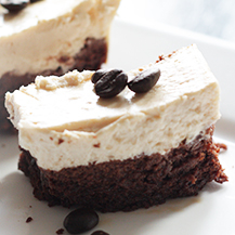 Verwarm de oven weer voor op 200 graden. In een keukenmachine of blender mix je de kwark en de yoghurt tot een gladde massa. Er mogen geen klontjes achterblijven. Voeg dan de eieren, koffie, vanille, agavesiroop en maïzena toe en mix dit nog een minuutje. Schraap even goed langs de zijkanten met een lepel tot alles door elkaar zit en je een gladde vulling voor je cheesecake hebt. Giet dan de vulling bovenop de afgekoelde bodem en bak in zo'n 30 minuten af. Houd de cake ondertussen in de gaten gezien niet alle ovens hetzelfde zijn.