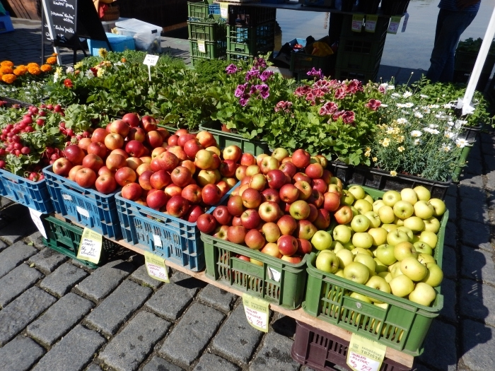 Van deze markt had ik eigenlijk niet zo veel verwacht. Een boerenmarkt dacht ik, maar het was echt heel veel meer dan dat. Alleen de sfeer al: langs de rivier gelegen met zelfs een rij kramen op een boot.
