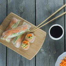 Snijd de kipfilet in reepjes en marineer in sojasaus en knoflook. Doe de kipfilet in de koelkast en laat minstens een half uur intrekken. Spray een pan in met Smart Cooking Spray en bak de kipfilet goudbruin. Doe warm water in een laag bord en week de rijstvellen om de beurt voor een ½ minuut in het water totdat hij zacht aanvoelt. Leg een rijstvel op een droog bord of snijplank. Leg een aantal reepjes kip, paprika, komkommer, bosui en wortel in het midden van het rijstvel. Vouw dan de buitenzijden van het rijstvel naar binnen en rol hem voorzicht op als een soort loempia. Doe dit ook bij de overige 7 rijstvellen. Maak daarna een gezonde pinda dip door pindakaaspoeder te mengen met water of dip de springrolls in sojasaus.