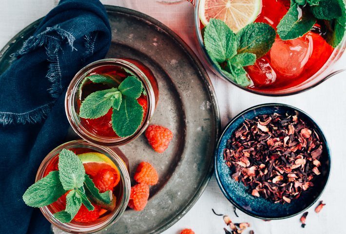 Wij brouwen de ijsthee volgens de cold brew methode. Normaal gesproken kook je water en laat je de thee in het hete water trekken. Bij de cold brew methode doe je het net even anders. Je doet koud water in een kan en daar laat je de thee in trekken, of in dit geval de hibiscus. Je kunt het er gewoon los in doen (zonder zeefje of zakje). Je zeeft de ijsthee naderhand. De ijsthee zet je voor een paar uurtjes in de koelkast, zodat de thee goed kan trekken. Om nog wat extra smaak toe te voegen, doen we er verse framboosjes, limoen en munt bij. En zo heb je een heerlijk verfrissend zomerdrankje.