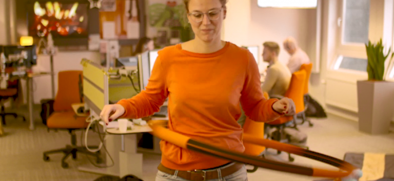 Ik leer dat je heus niet de hele werkvloer nodig hebt om te hoelahoepen en je al helemaal niet heftig hoeft rond te draaien met je complete lichaam. Dat scheelt, want die vreemde moves zagen er wel een beetje gek uit. Gewoon steady gaan staan met je benen een beetje gespreid, je rechtervoet iets meer naar voren plaatsen dan je linker en klaar ben je! Fijn, zo is je kop koffie, het beeldscherm en jouw favoriete collega compleet veilig. Geen (om)stoot gevaar.