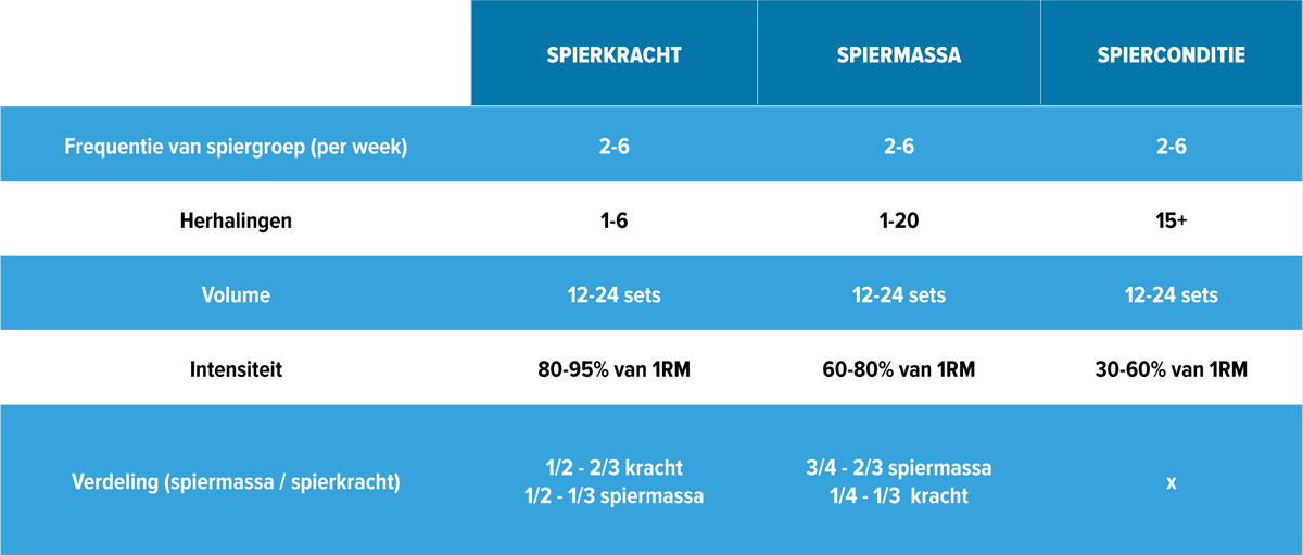 In de bovenstaande tabel worden de termen frequentie, herhalingen, volume, intensiteit en verdeling aangehaald.