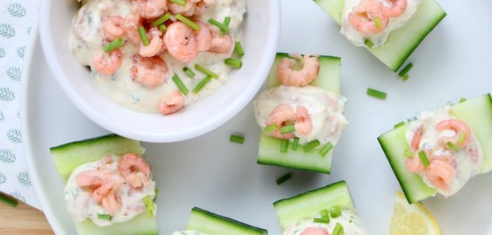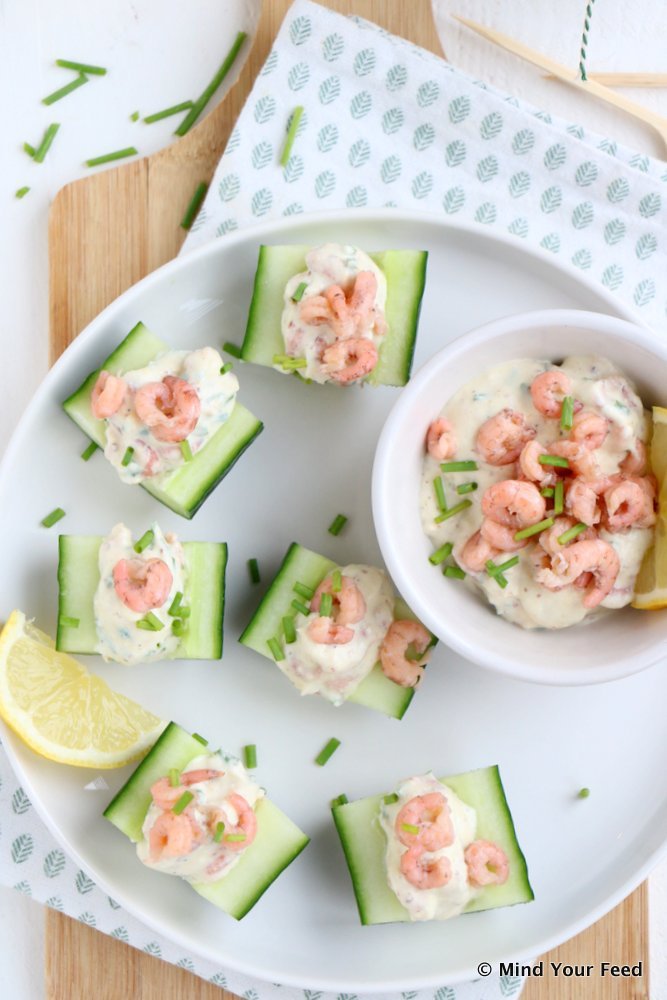 Zo, dat was Kerst... Hoe waren jouw dagen? Ik heb heerlijk van de rust genoten en ontzettend lekker gegeten met mijn lieve familie. En dan is deze week altijd een beetje rare week vind ik. Die dagen tussen Kerst en Oud & Nieuw zijn een soort feestdagen, maar toch probeer ik nog een beetje gewoon te doen. Om nou de hele vakantie in hiep-hiep-hoera stemming te blijven hangen, dan heb ik straks half januari nodig om bij te komen.... Deze week doen we dus thuis rustig aan, maar ik heb al wel wat makkelijke hapjes voor de eindejaarsviering voor je klaar staan. Zoals deze Hollandse garnalensalade op een stukje komkommer.