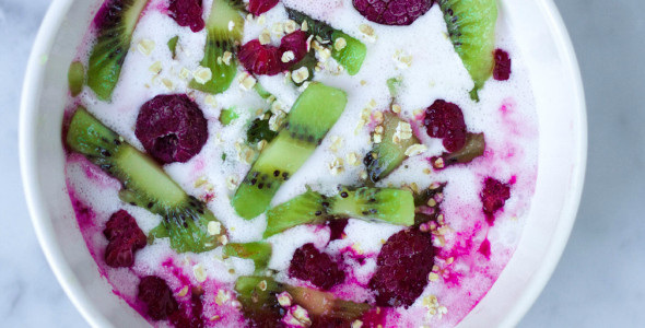 "Vandaag heb ik een 2-in-1 recept voor je. Want dit ontbijt is pas echt lekker wanneer je beide receptjes samen eet: zelfgemaakte kokosmelk met daar doorheen aardbeienjam is echt een geweldige combi. De kokosmelk is lekker romig en de jam heerlijk fris en zoet. Gebruik je favoriete fruit als topping en geniet van dit vrolijke ontbijtje in de zon, dan kan je dag niet meer stuk!"