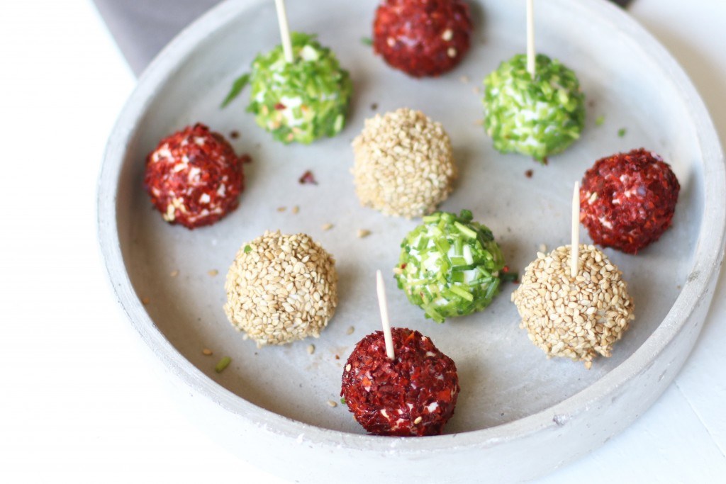 De bonbons zijn binnen een paar minuten gemaakt, zien er onwijs leuk uit door alle kleurtjes en staan gezellig op tafel tijdens een borrel of verjaardag. Je kunt ze van te voren maken zodat je ze op de dag zelf alleen nog maar uit de koelkast hoeft te toveren. Nu kun je ook eeeeindeloos variëren met toppings maar ikzelf houd het simpel met verse bieslook, sesamzaadjes en rode peper. Heb je zin om jezelf uit te sloven? Probeer dan ergens kleine eetbare bloemetjes op de kop te tikken (bijvoorbeeld bij de Sligro) en versier de bonbons daar mee. Ooo’s en aahh’s gegarandeerd!