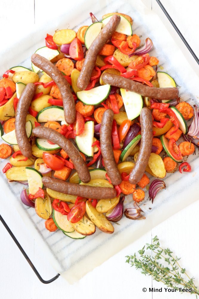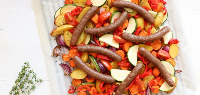 Oh, echt, ik ben nog niet geland hoor…. We waren natuurlijk de eerste twee weken van de vakantie in Italië en het lukt mij niet helemaal om terug te komen. Ik ben fysiek wel aanwezig, maar mijn hoofd blijft in het zonnige zuiden hangen. En bij makkelijke maaltijden, waar je eigenlijk geen omkijken naar hebt. Een beetje zoals ik de afgelopen tijd heb gegeten, simpel en eenvoudig maar wel heel smaakvol. Afgelopen week ging ik wel weer voor de blog aan de slag en ik bedacht om alle groenten die in huis waren in de oven te bereiden. En zo ontstond deze bakplaat vol met Italiaanse groenten met worstjes uit de oven.