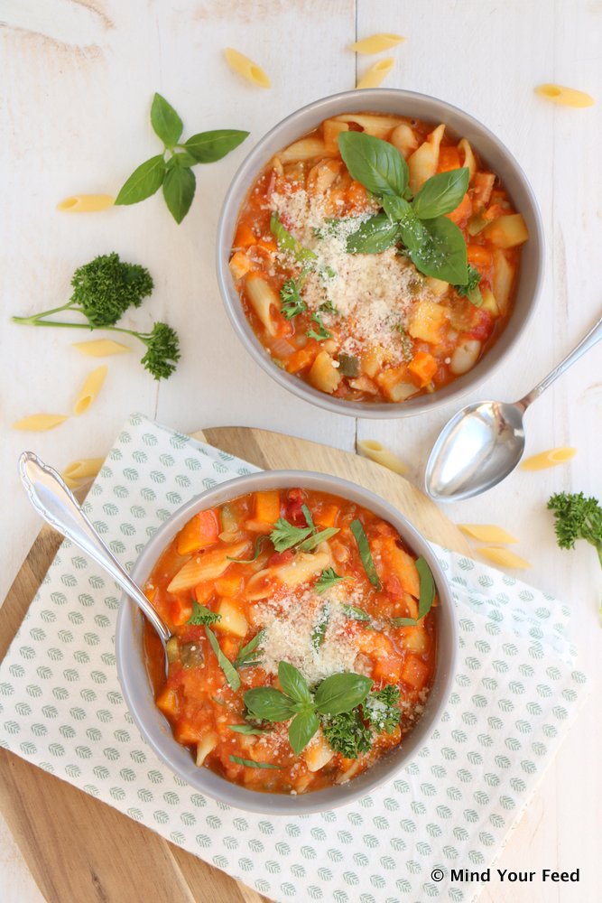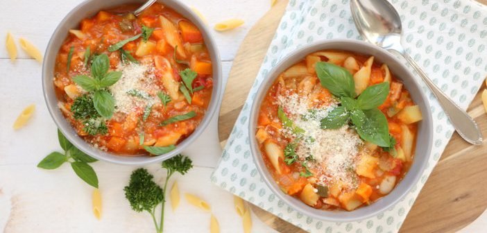 Nou de eerste griep heb ik er al op zitten hoor! De herfst is nauwelijks nog begonnen of ik lag al 3 dagen plat in mijn bed. Echt gestrekt, ik kon niets meer. Meestal als ik verkouden ben, of niet zo lekker, dan draait mijn leven redelijk door. Ik doe dan gewoon alles wat ik moet doen, maar dan in een versnelling lager. Afgelopen dagen was dat niet aan de orde. Ik heb alleen maar in bed gelegen, en pas gisteren voelde ik me iets beter. Iets beter. Goed genoeg om met de laptop op de bank te kruipen en deze blog met het recept voor Italiaanse groentesoep uit te tikken. En soep is altijd goed als je ziek bent, dus ik zou er het liefst nĂș een kom van opscheppen.