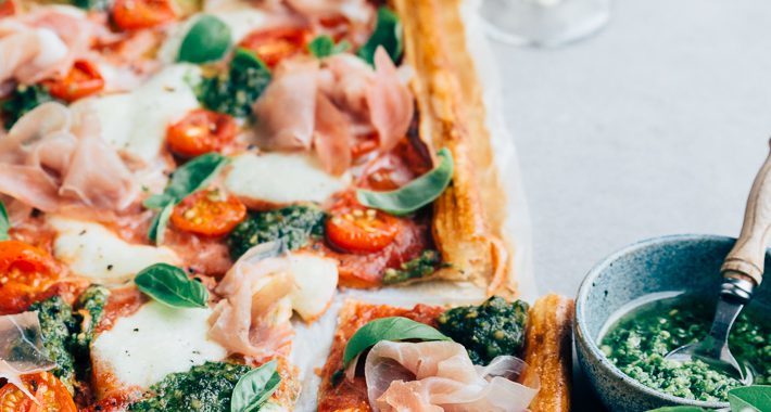 Ingrediënten voor 1 plaattaart 1 rol vers bladerdeeg 250 ml passata 1 tl oregano Peper en zout 2 bollen mozzarella 100 gram cherrytomaten 70 gr pesto 30 gr Parmezaan 100 gr prosciutto Paar takjes verse basilicum