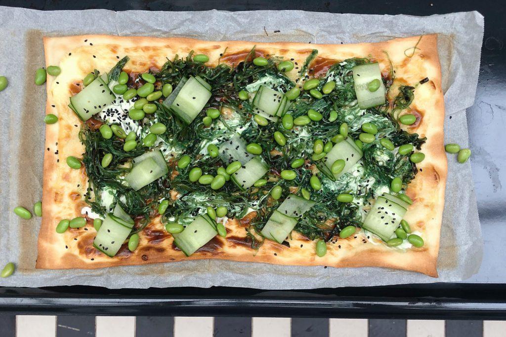 Oke, dit was een dingetje. Want HOE ga je dit omschrijven? Plaattaart? Filodeeg met sushitoppings? Japanse pizza….? Anyways: het was lekker. Een knapperige bodem van filodeeg met een licht pittige creme fraiche topping en frisse wakame, komkommer en edamame. Via via werd ik getipt op dit recept en toevallig at ik een soortgelijk gerechtje bij een restaurant in Amsterdam. Dat moeten wij ook kunnen. En dus zijn wij de keuken in gedoken en tadaaa! Aanradertje hoor. Kan als lunch, bij de borrel, avondeten. Bijvoorbeeld met deze Aziatische salade on the side. Maar duik vooral een keertje de keuken in om dit receptje te maken.