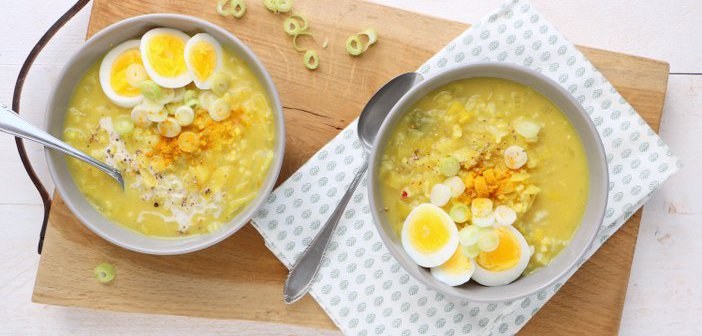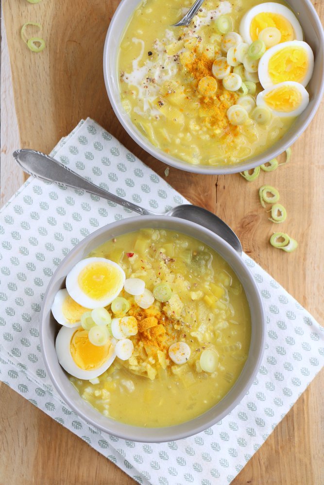 Stiekem begin ik al weer aan soep te denken. Of nou ja, stiekem, er komt in de zomer ook heus wel eens een soepje op tafel. Maar dat zijn wel de wat lichtere varianten, en ik eet eigenlijk liever een goede salade of lichte maaltijd. Maar nu we in de tweede helft van het jaar zitten, en ik achter de schermen al druk bezig ben met plannen van allerlei winterse gerechten, vond ik het ook wel weer tijd voor soep. Geen idee of de herfst nog lang op zich laat wachten, maar deze kerriesoep met rijst en ei deel ik alvast met je.