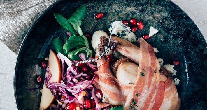 En bij dit kwartel recept? Een hele lekkere rode koolsalade, met balsamico azijn. Die kun je al van tevoren maken. Wanneer je de rode kool namelijk een paar uur in de balsamico azijn laat staan wordt de kool zachter en nog lekkerder. Ik snijd de rode kool op een mandoline, maar het kan ook heel fijn gesneden worden met een mes. Hoe fijner hoe lekkerder. De salade is heerlijk met stukjes appel, nootjes en spek crumble en op het laatst strooi je er nog wat van die leuke granaatappelpitjes over. Super feestelijk. Wanneer je er meer werk van wilt maken kun je er een lekkere aardappel- of knolselderijpuree bij maken.
