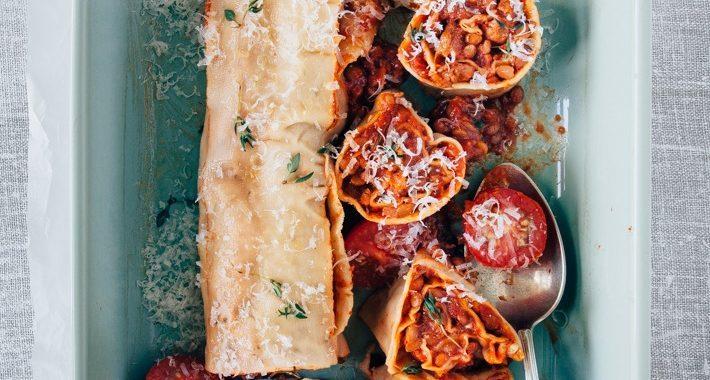 Nou denk je wat is er dan wel spannend aan? De pastarol. Die kook je in zijn geheel, met de vulling er dus al tussen, in een pan. Om te zorgen dat de vulling er niet uit loopt rol je de pastalap goed op. Dit doe je met behulp van een theedoek. Die leg je eerst op je aanrecht, leg de lap pasta erop. Spreid de vulling over de pastalap en rol hem dan zo strak mogelijk (lange kant) met behulp van die theedoek op. Dan bind je hem net als een snoepje aan weerzijde vast met een stuk keukentouw. Dat is dan het spannende gedeelte. Je kookt hem dus in zijn geheel 30 minuutjes in kokend water. Overigens kan het ook allemaal een dag van tevoren. Het is net als lasagne, de pastarol wordt na een dag nog lekkerder en gemakkelijker te snijden. Opwarmen doe je dan in de oven.