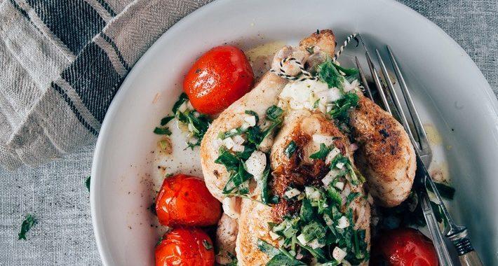 Maak tot slot nog een snelle salsa verde van fijngehakte lekkere verse kruiden zoals platte peterselie en dragon. Hieraan voeg je nog wat olijfolie en witte wijn azijn toe. Heel lekker fris bij de tomaatjes en boursin. Wanneer je nog wat aardappeltjes met boter, wat citroenschil en olijfolie in de oven roostert heb je een heerlijk hoofdgerecht.